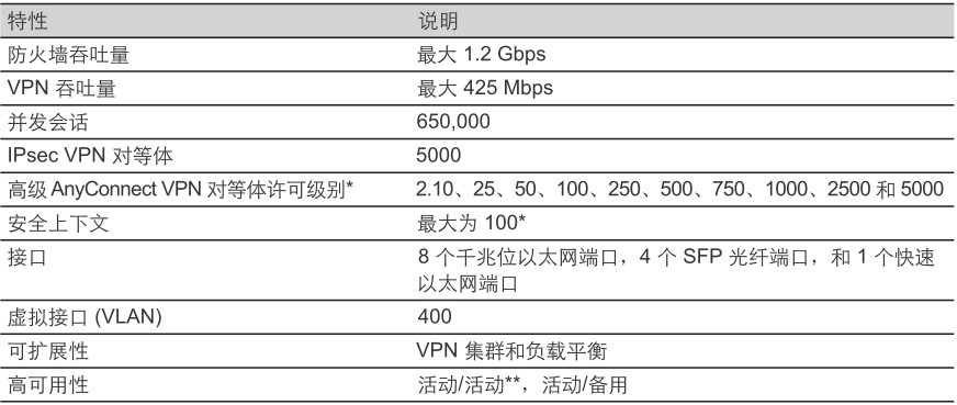 表 1 列出了 Cisco ASA 5540 的特性